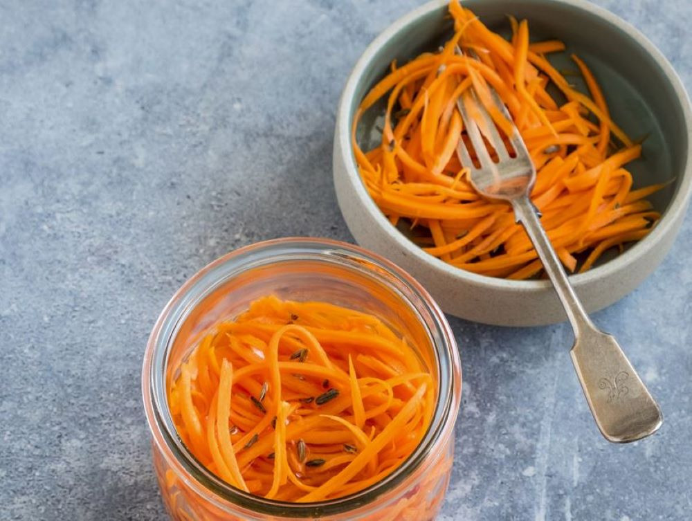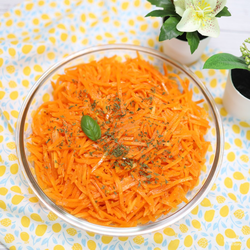 - 드레싱이 당근에 고르게 묻도록 손이나 큰 포크를 이용해 잘 섞습니다. 당근이 드레싱을 잘 흡수하도록 가볍게 버무리듯 섞어주세요.