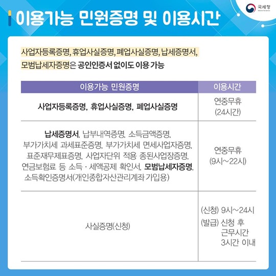 세금 관련 업무를 위해서는 다양한 증빙 서류가 필요할 때가 많습니다. 홈택스는 이러한 증빙 서류를 쉽게 출력할 수 있는 기능을 제공합니다.