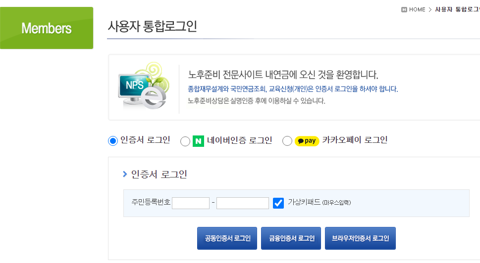공인인증서, 금융인증서, 네이버인증서, 카카오페이 인증서로 인증이 가능합니다.