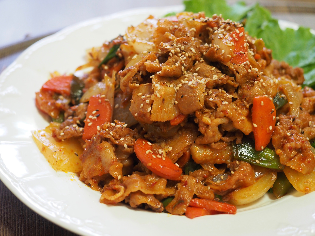 마지막으로 참기름을 한 방울 둘러주시고 통깨를 뿌려주시면 향긋하고 맛있는 제육볶음이 완성됩니다. 상추나 깻잎에 싸서 쌈장과 함께 드시면 더욱 맛있게 즐기실 수 있습니다.