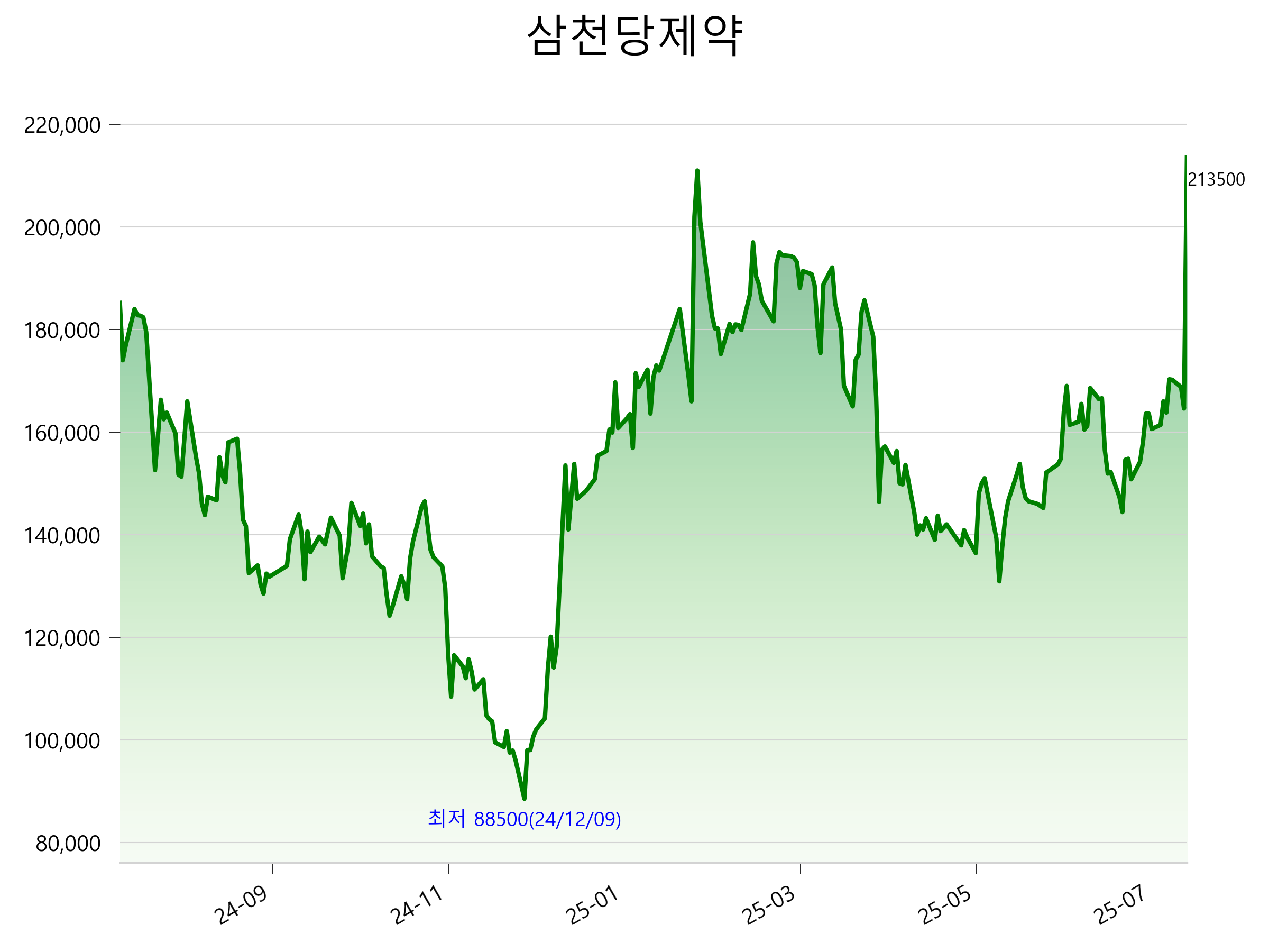 7월 23일 기준 주가는 213,500원 입니다. 아래는 최근 1년간의 주가흐름입니다.