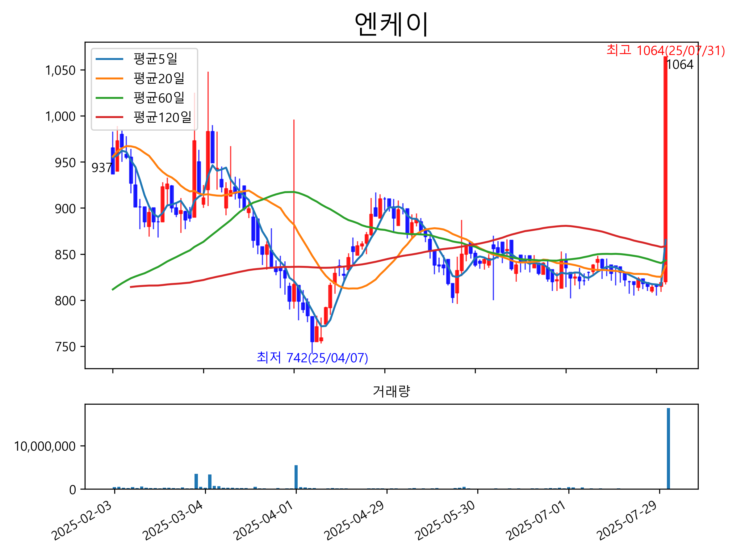 최근 6개월간 캔들차트 및 이동평균선입니다.
